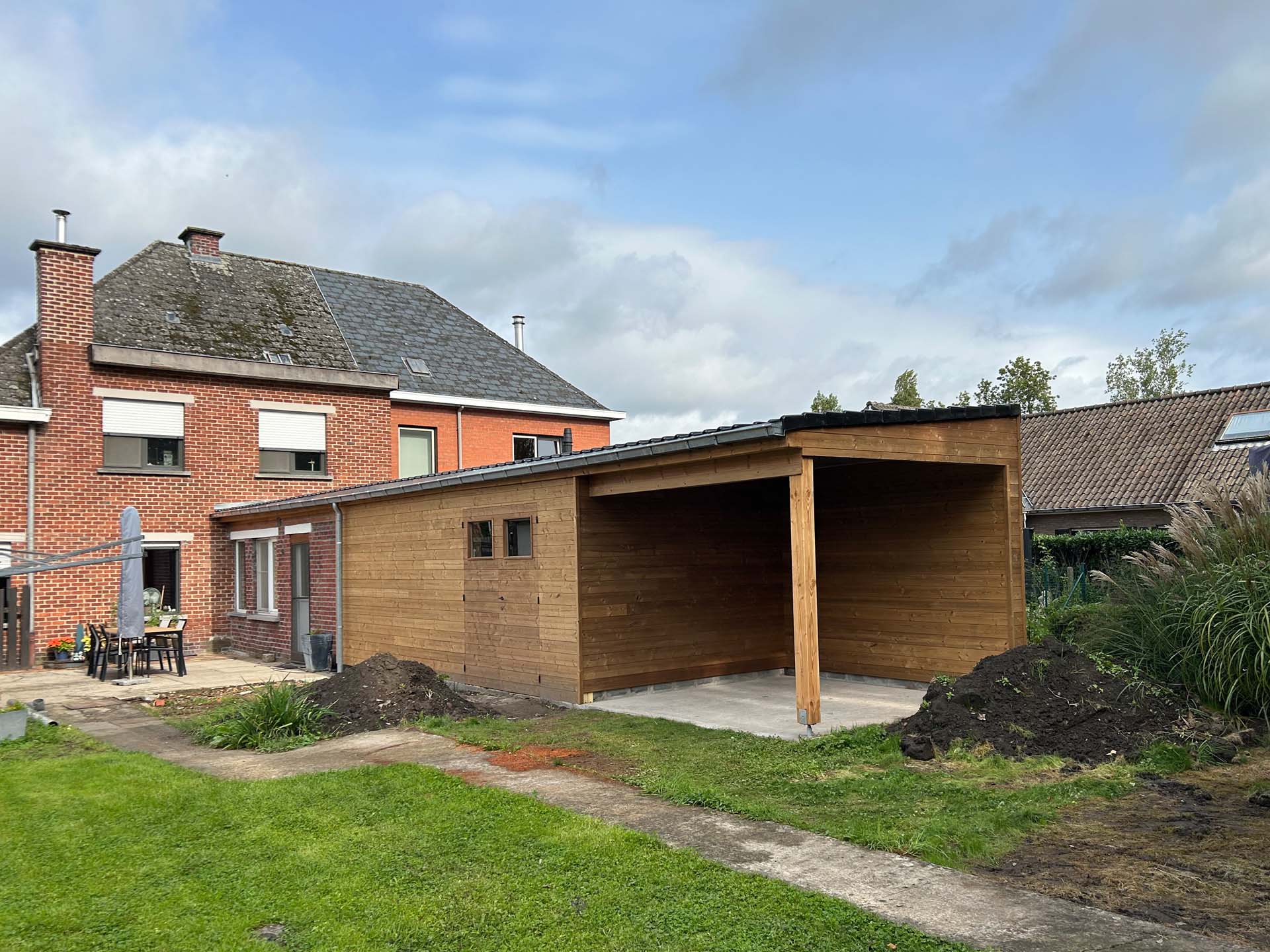 Voor dit tuingebouw in Heurne realiseerde GLA Projecten een complete buitenruimte: van gevelbekleding in thermowood tot een overdekt terras en tuinberging. Daarnaast werd het dak van de keuken vernieuwd, waardoor het geheel harmonieus aansluit bij de bestaande woning.