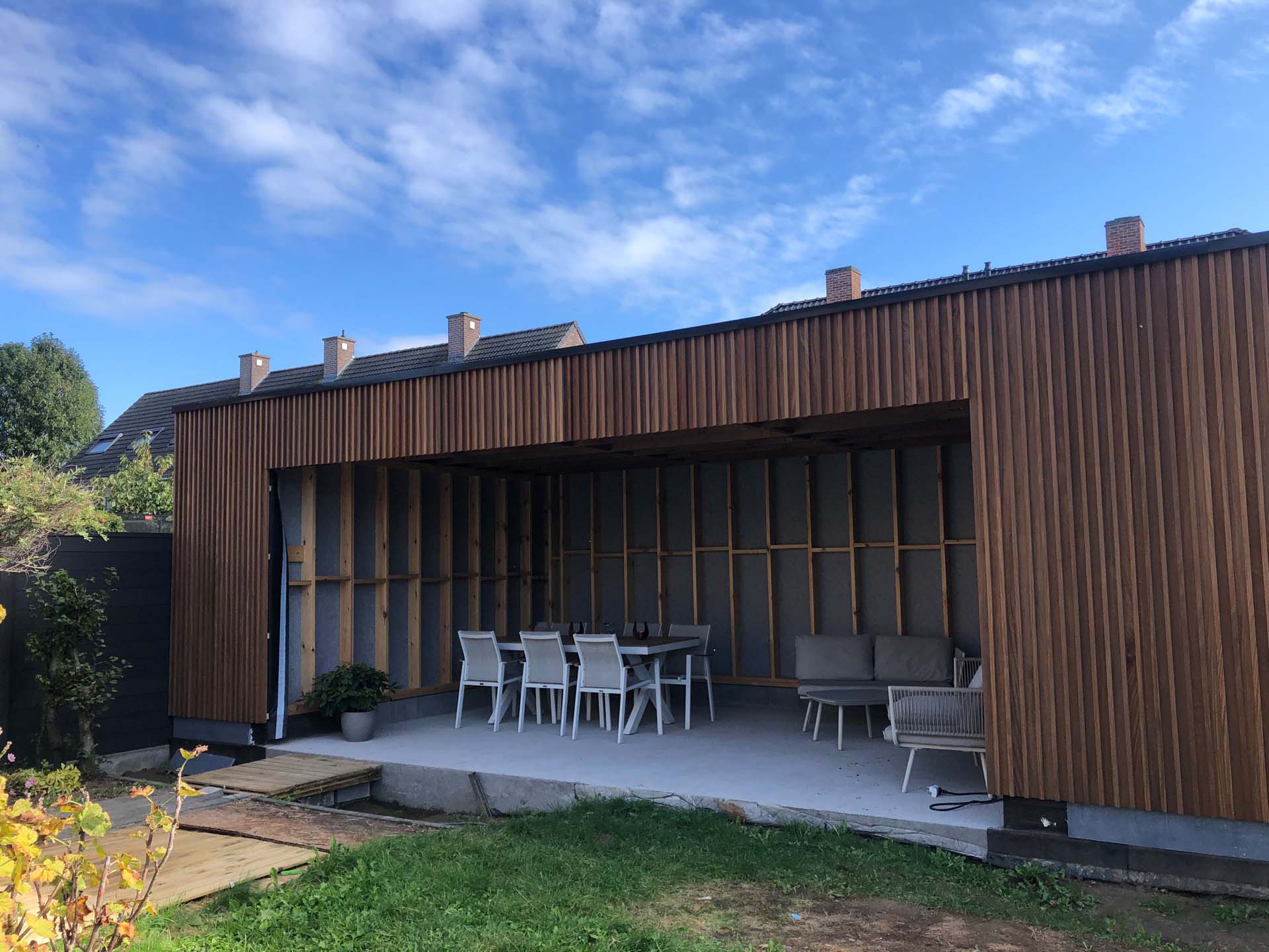 Tuingebouw in Petegem met afrormosia gevelbekleding