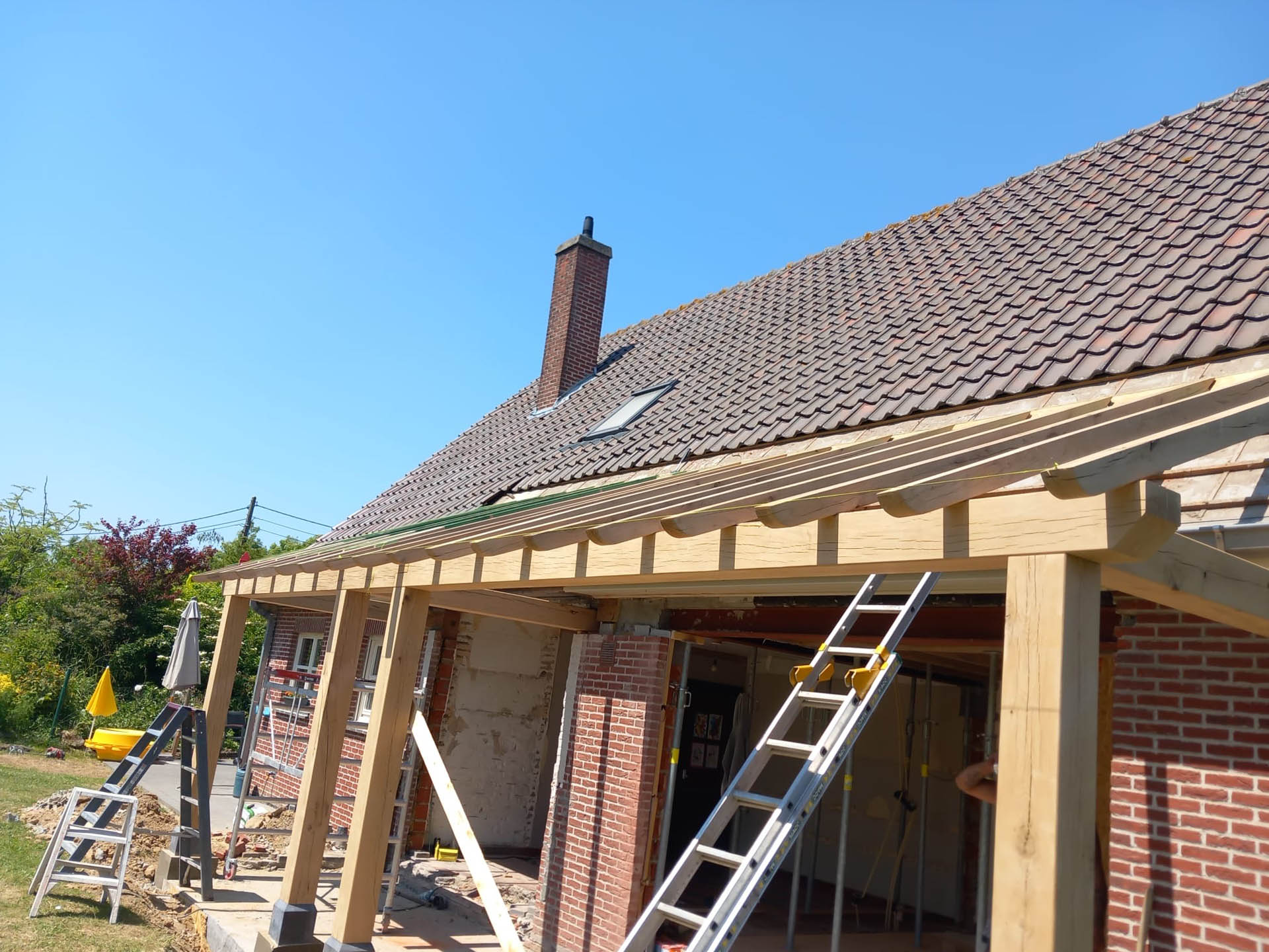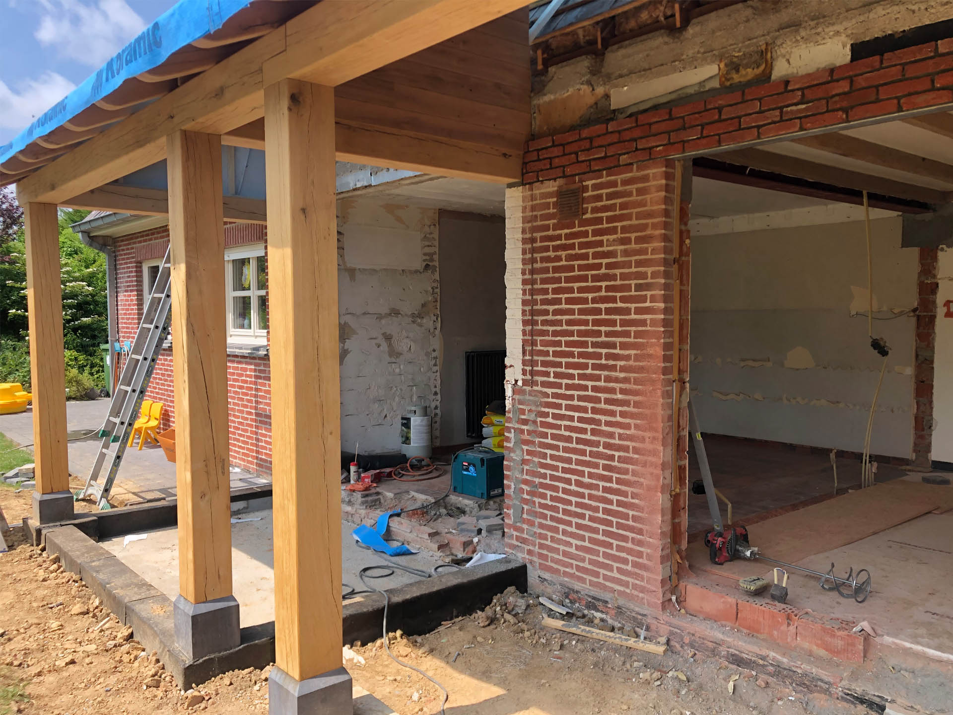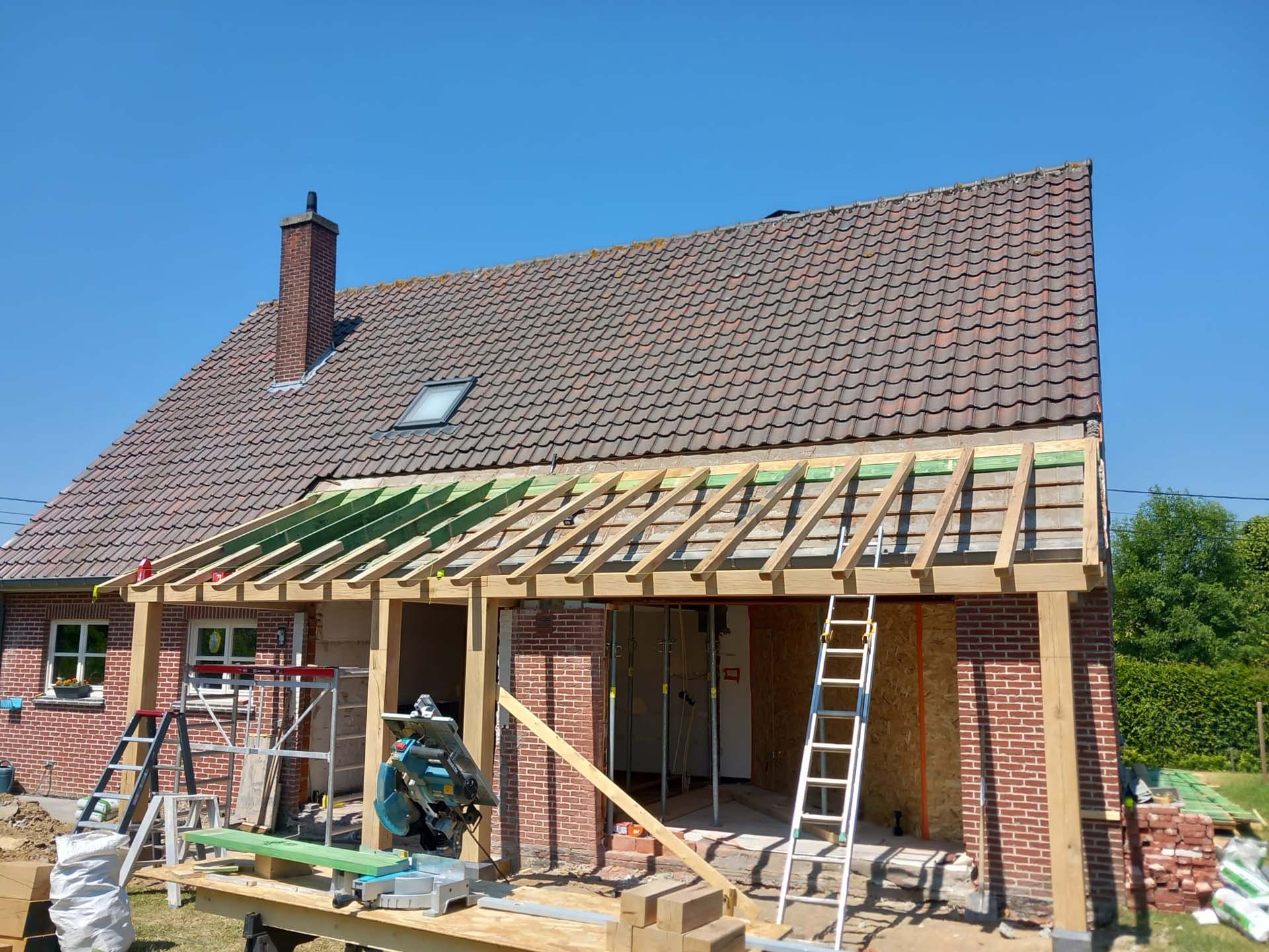 Voor deze woning in Zulzeke realiseerde GLA Projecten een doordachte verbouwing en uitbreiding van de leefruimte en keuken. De nieuwe uitbreiding werd uitgevoerd met een eiken constructie, wat zorgt voor een warme, tijdloze uitstraling. Door de aanpassing van het dakvlak sluit het nieuwe volume perfect aan bij de bestaande woning. Dit project toont hoe functionaliteit, architecturale samenhang en kwalitatieve materialen hand in hand gaan.