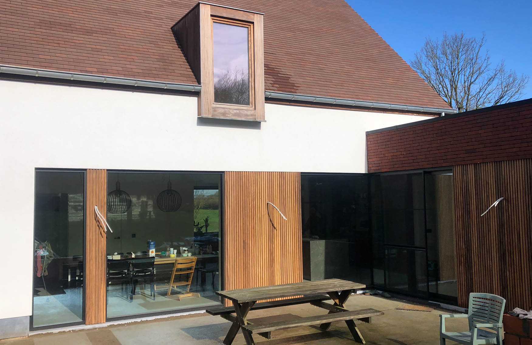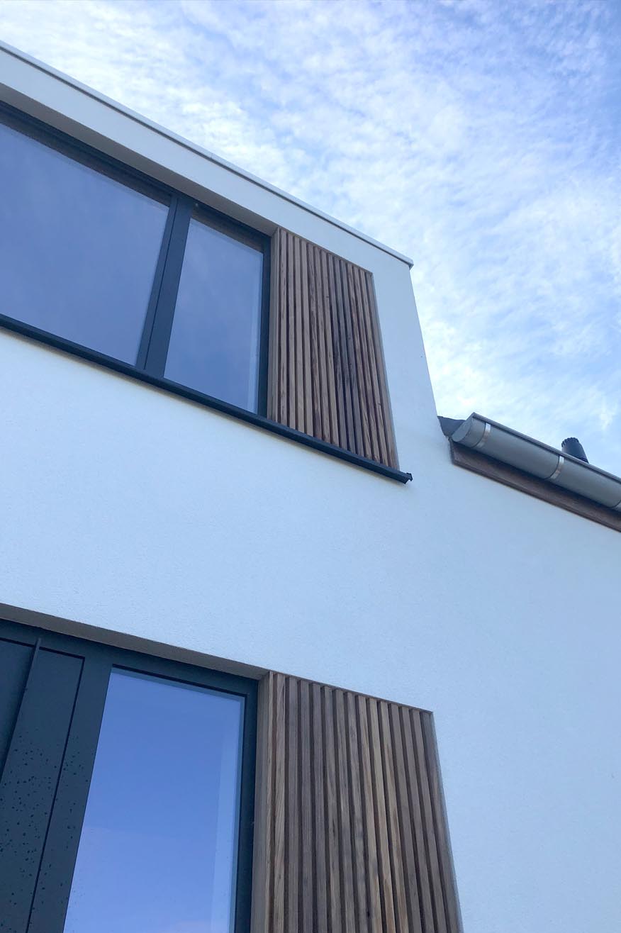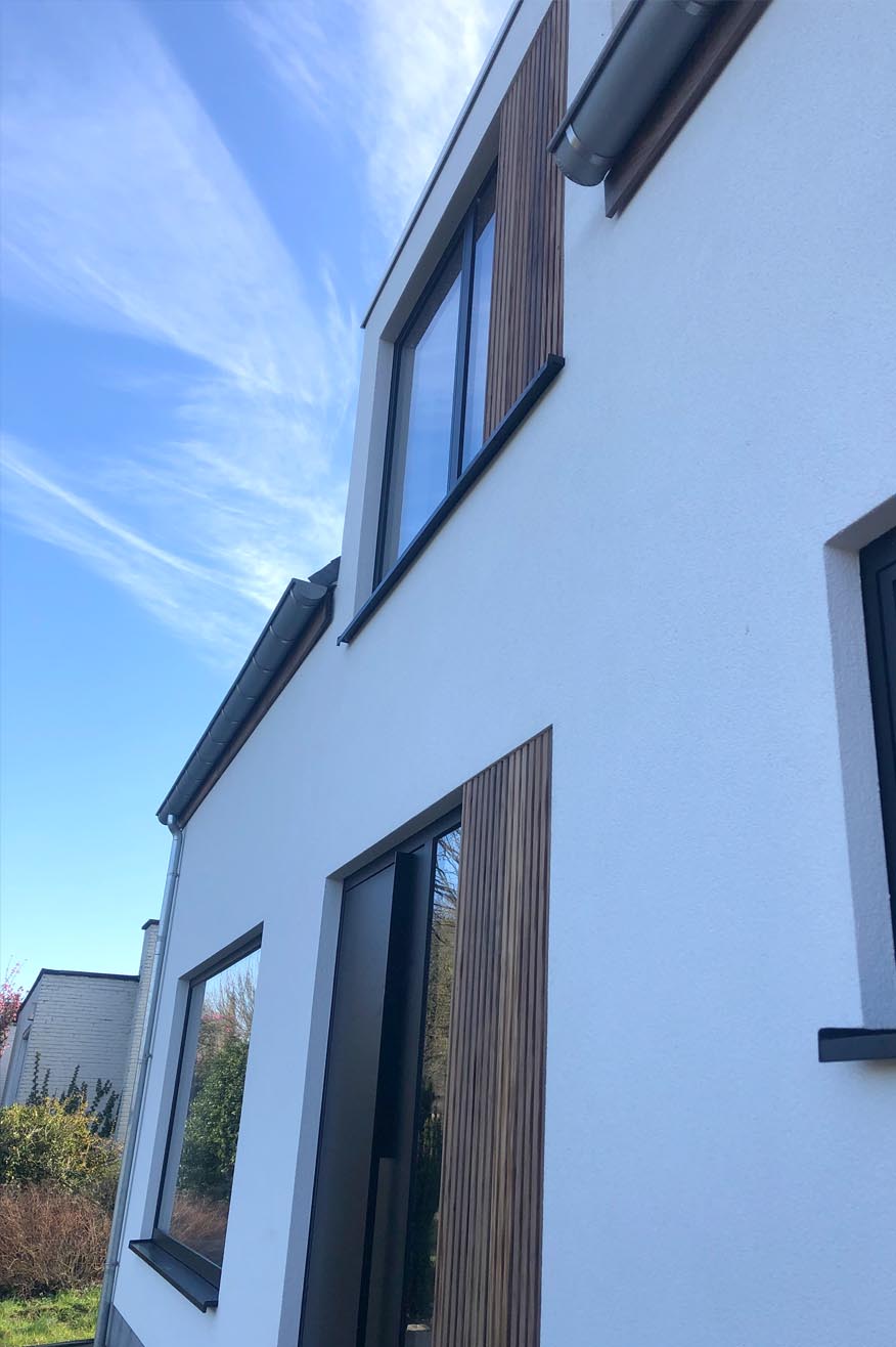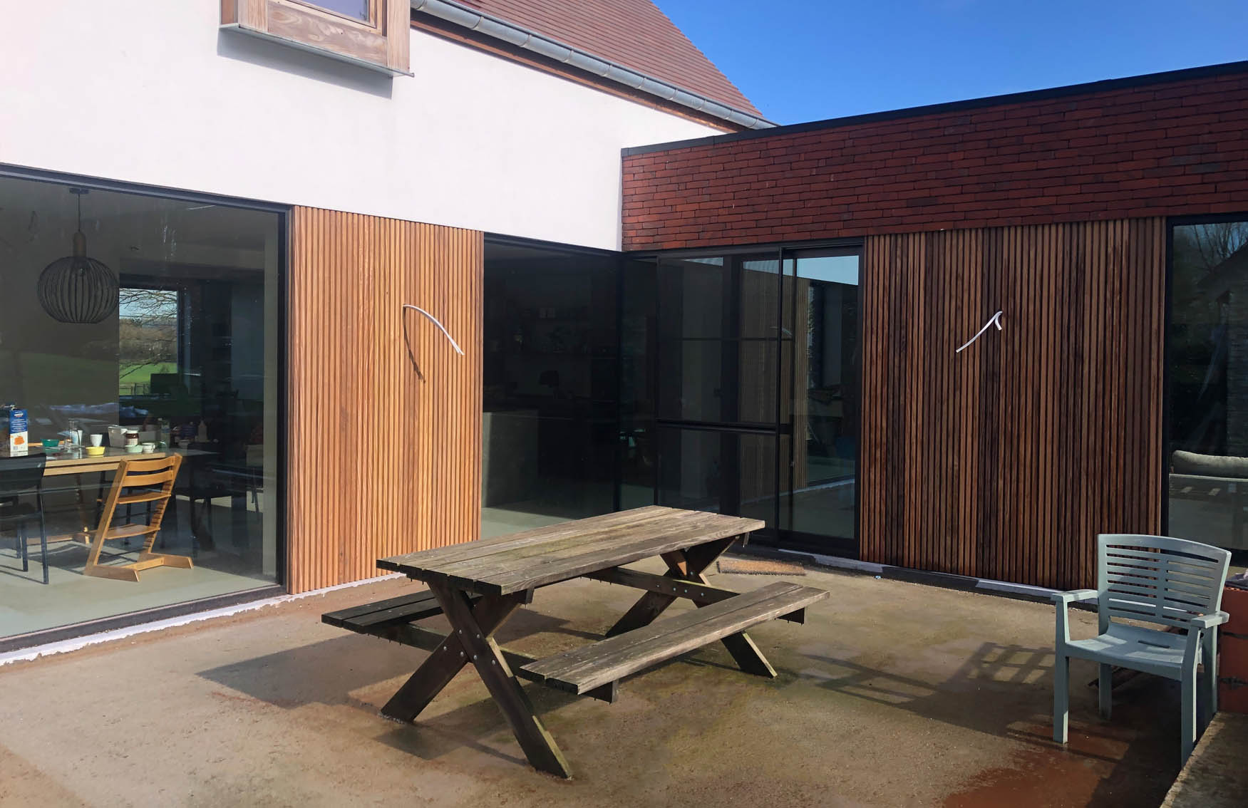 Voor dit project in Wortegem verzorgde GLA Projecten de afrormosia gevelbekleding.