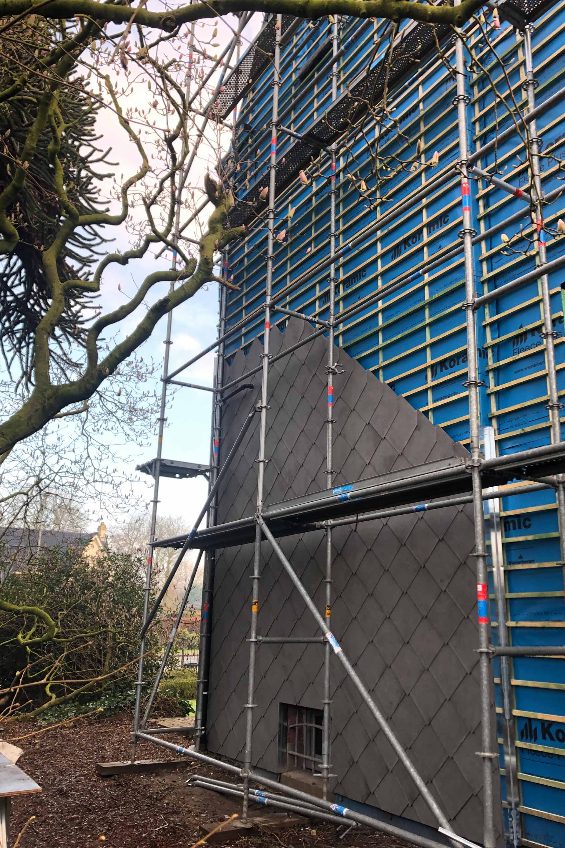 Voor dit project in Wortegem realiseerde GLA Projecten een volledige gevelbekleding met leien, gecombineerd met isolatie en een hoogwaardige gevelfolie. Deze aanpak zorgt niet alleen voor een strakke en tijdloze uitstraling, maar ook voor een verbeterde energieprestatie en duurzame bescherming van de woning. Het resultaat is een technisch sterke gevelafwerking met oog voor detail en lange levensduur.
