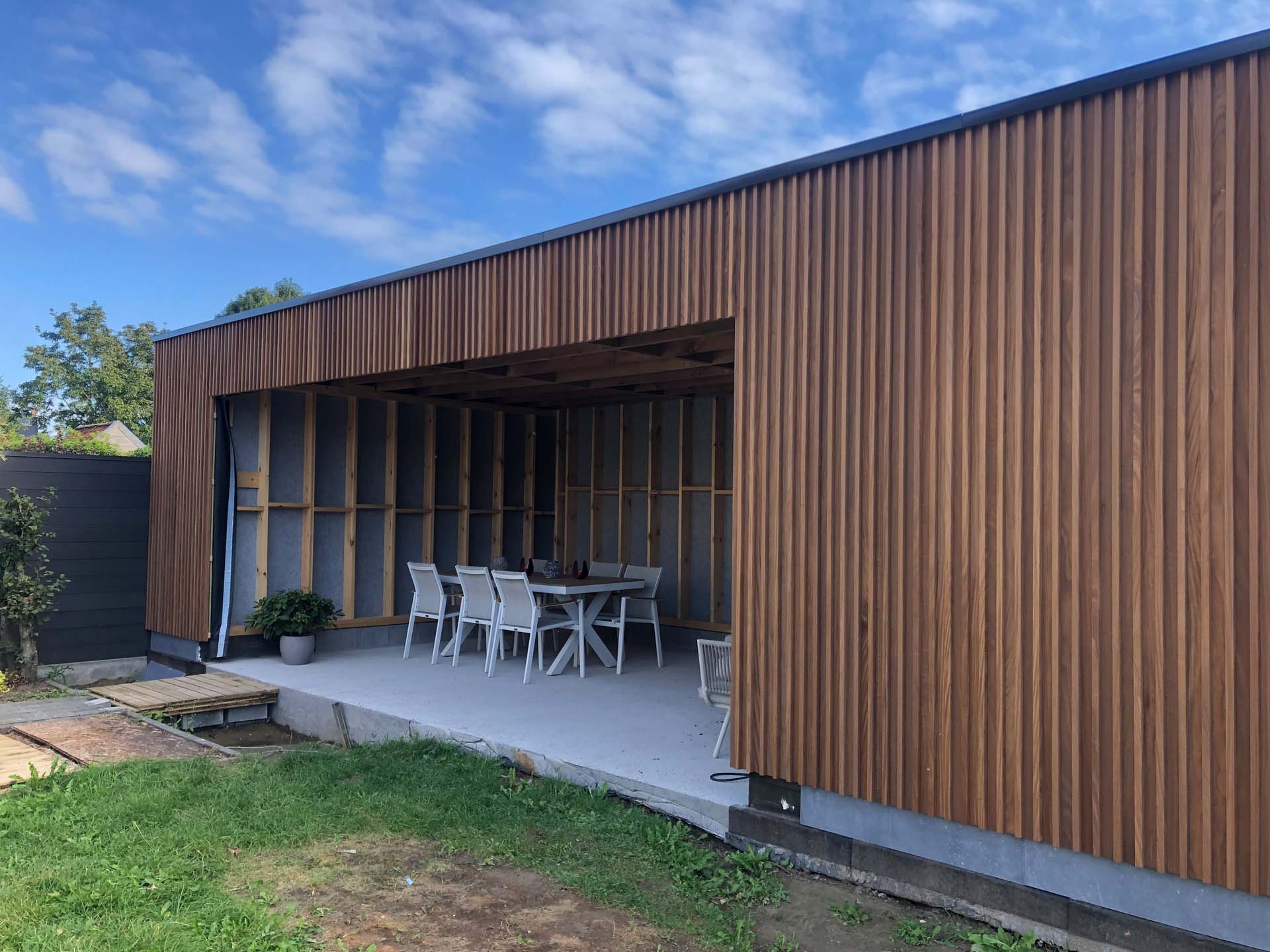 Tuingebouw in Petegem met afrormosia gevelbekleding