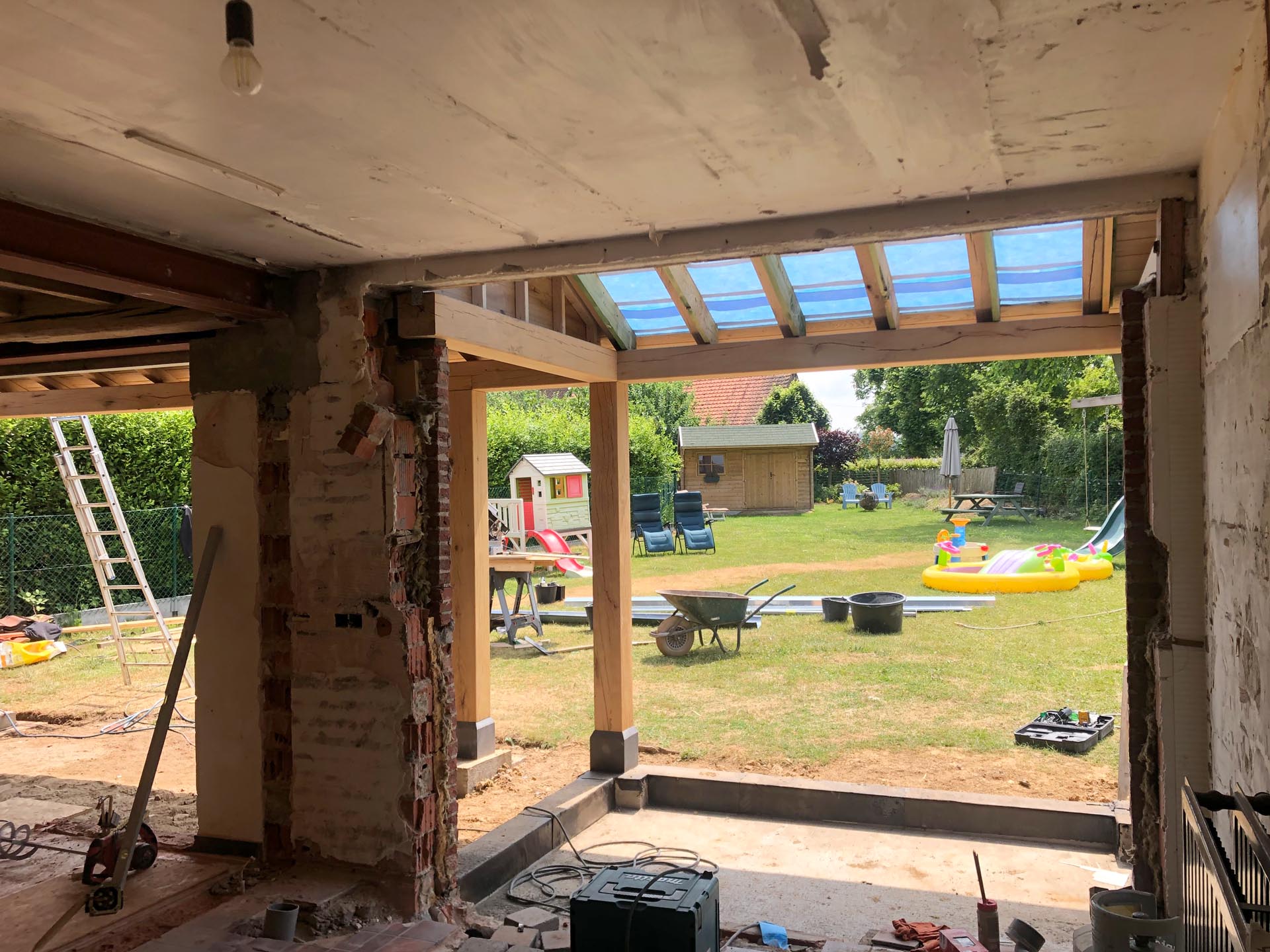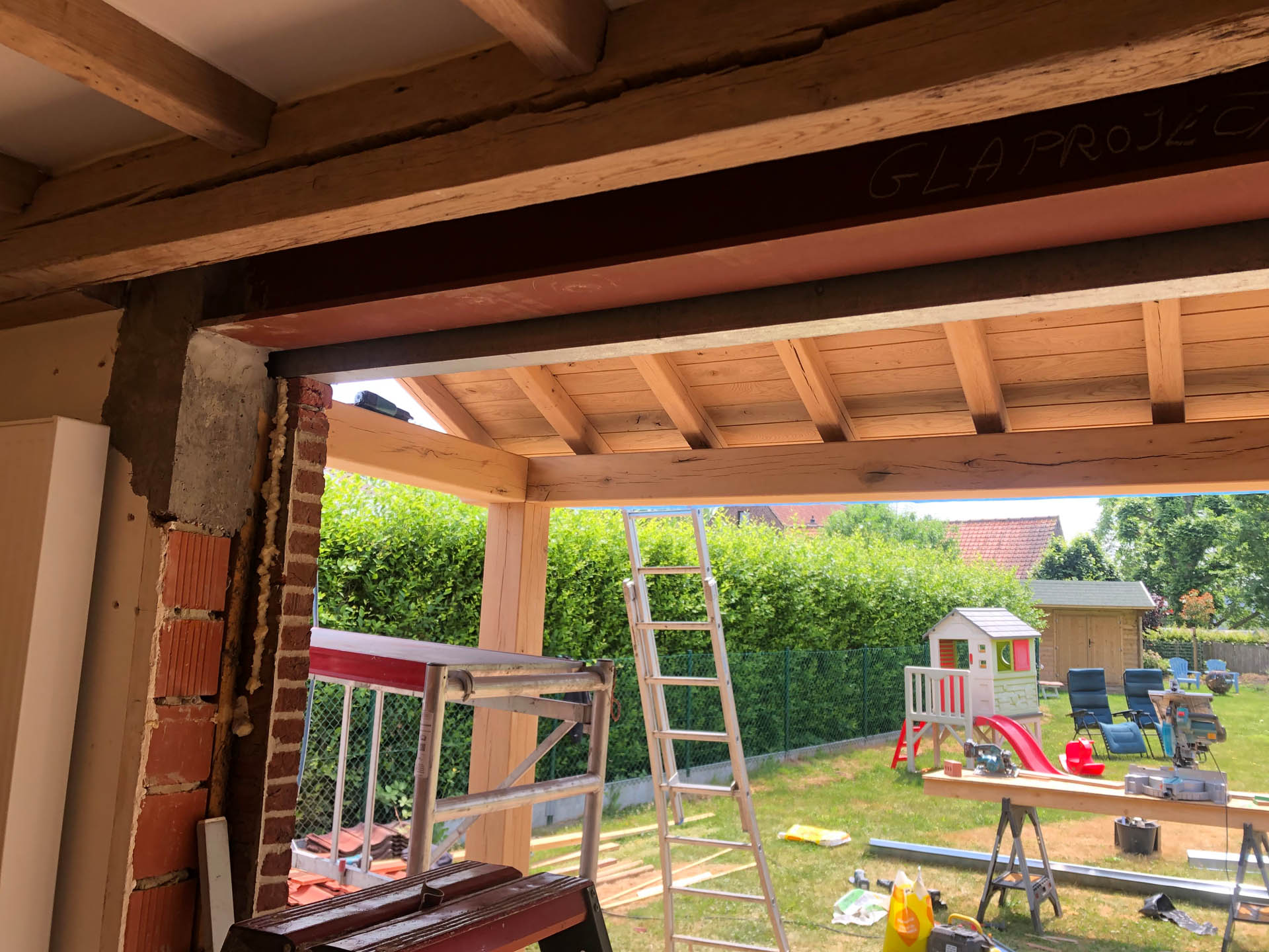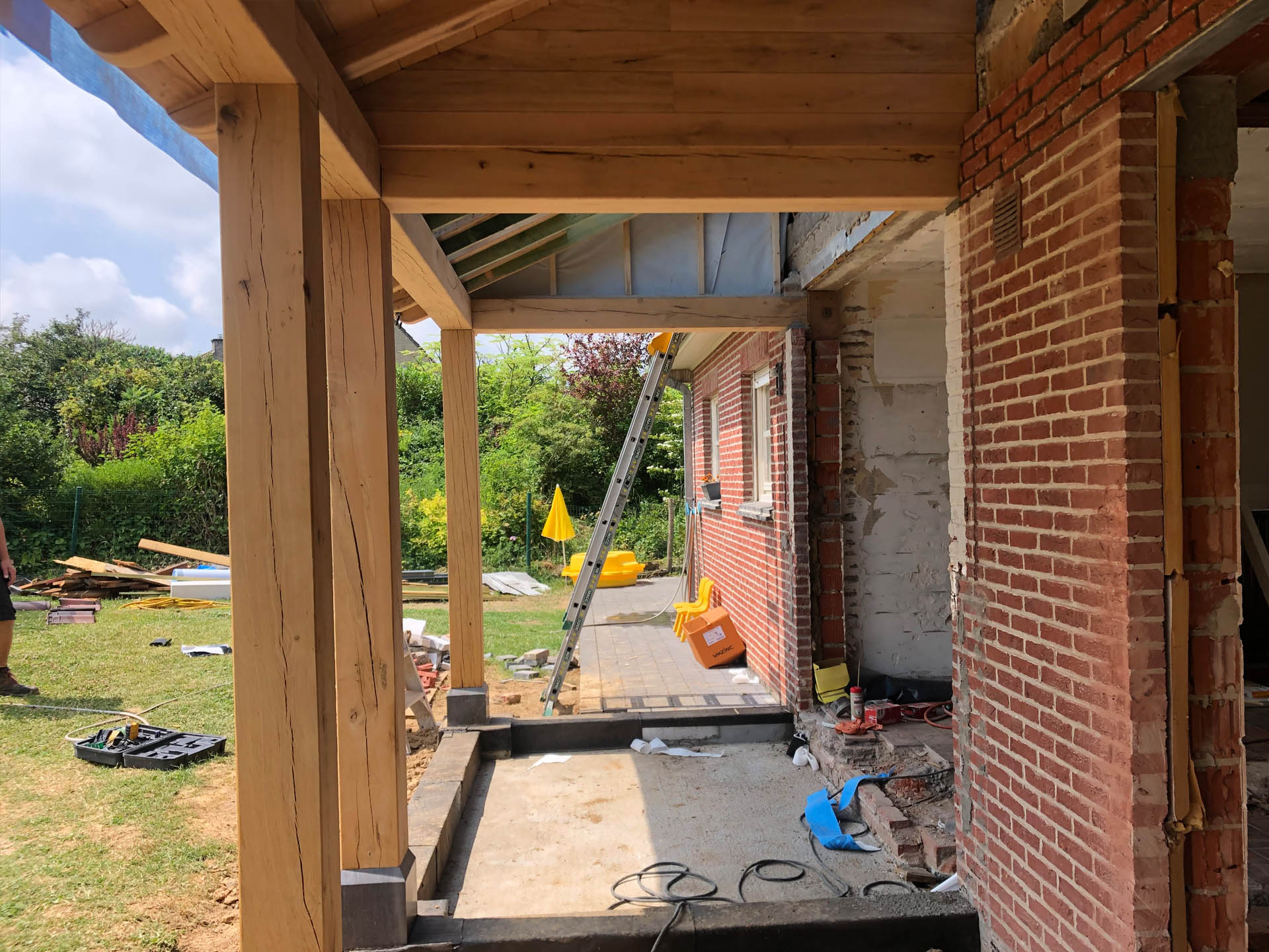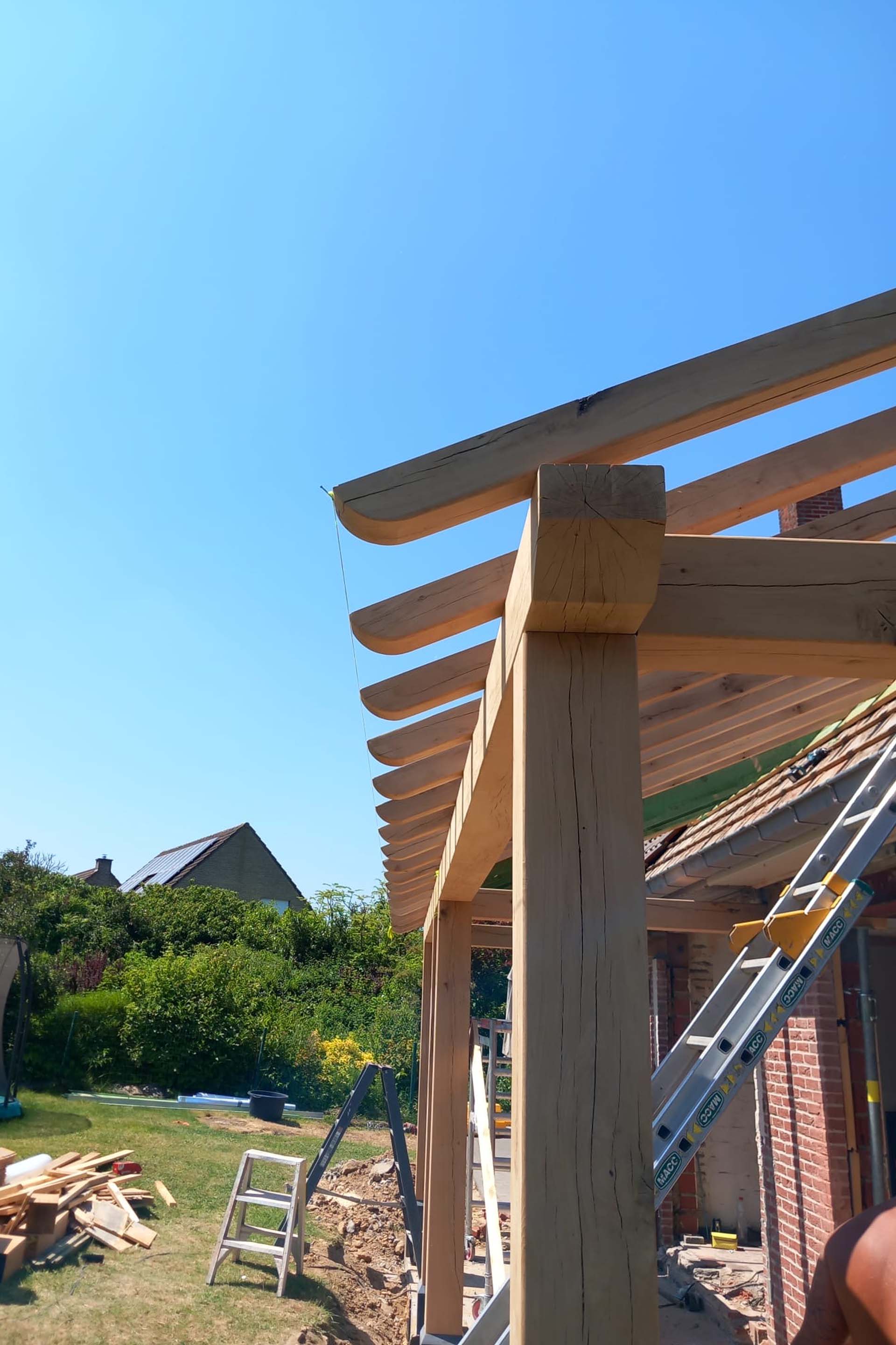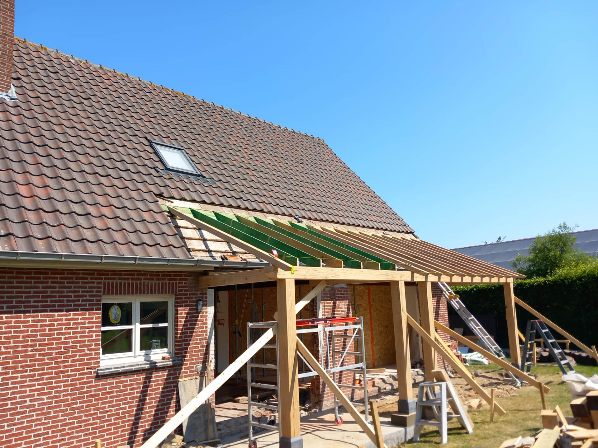 Voor deze woning in Zulzeke realiseerde GLA Projecten een doordachte verbouwing en uitbreiding van de leefruimte en keuken. De nieuwe uitbreiding werd uitgevoerd met een eiken constructie, wat zorgt voor een warme, tijdloze uitstraling. Door de aanpassing van het dakvlak sluit het nieuwe volume perfect aan bij de bestaande woning. Dit project toont hoe functionaliteit, architecturale samenhang en kwalitatieve materialen hand in hand gaan.